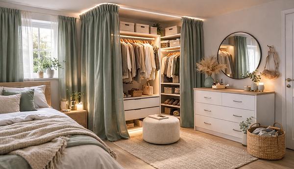 Moodboard-Visualisierung: Ankleide-Ecke mit Vorhanglösung im Schlafzimmer (KI-generiertes Stimmungsbild)