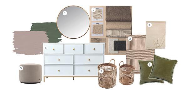1. Wandspiegel 80cm x 80cm | Melody Maison 2. Jede Stoffprobe zeigt die Qualität, Haptik und Farbwirkung der Textilien im Original | Dekoria GmbH 3. Marimekko Teppich Kalasääski | Traumteppich.com 4. Plaid Boston | Eagle Products Textil GmbH 5. Rachel Pouf | Domkapa 6. Aisby Kommode | Melody Maison 7. Dekokorb aus Seegras | kobolo 8. Vivaraise Kissen | Idyll Home