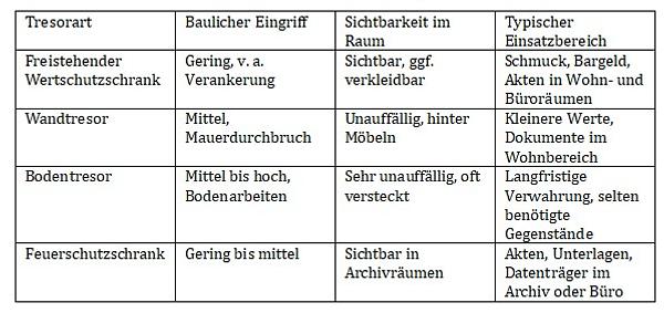 Die folgende Übersicht stellt verbreitete Tresorarten gegenüber, die in historischen Immobilien häufig eingesetzt werden. Die Tabelle zeigt, wie sich Einbauaufwand, Sichtbarkeit und typische Einsatzbereiche voneinander unterscheiden.