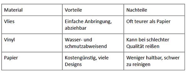 Die Wahl des richtigen Materials ist ein entscheidender Faktor bei der Auswahl von Türtapeten. Es gibt verschiedene Materialien, die jeweils ihre eigenen Vor- und Nachteile haben. In der folgenden Tabelle sind einige gängige Materialien und ihre Eigenschaften aufgeführt: