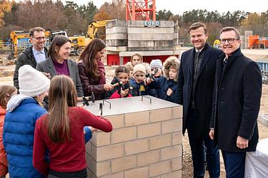 In der Fischbacher Hauptstraße 118 entsteht ein multifunktionaler Gebäudekomplex mit einem dreigruppigen Hort für 75 Kinder, einer modernen Einfachsporthalle sowie zusätzlichen Fachräumen für die Grundschule Fischbach. Die WBG KOMMUNAL GmbH realisiert das Projekt im Auftrag der Stadt Nürnberg. Die Grundsteinlegung mit Oberbürgermeister Marcus König, Schulreferentin Cornelia Trinkl, der Referentin für Jugend, Familie und Soziales, Elisabeth Ries, Planungs- und Baureferent Daniel F. Ulrich sowie Ralf Schekira, Geschäftsführer der WBG KOMMUNAL GmbH, hat am Freitag, 14. November 2025, stattgefunden.