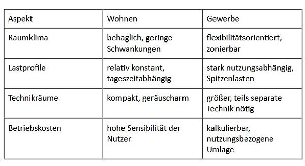 Technische Systeme müssen die unterschiedlichen Anforderungen von Wohnen und Gewerbe ausbalancieren. Ziel ist eine energieeffiziente, robuste und wartungsfreundliche Lösung mit planbaren Kosten.