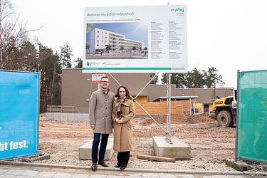 Bildquelle(n): Titelbild: wbg-Geschäftsführer Ralf Schekira (li.) und Wirtschaftsreferentin Dr. Andrea Heilmaier enthüllen die Bauplane in der Ursula-Wolfring-Straße 9 / Bild 2: Das Wohngebiet „SchönLebenPark“ aus der Vogelperspektive. / Bilder: Julian Wachtler, wbg Nürnberg