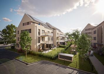 Eine bislang unbepflanzte, private Grasfläche wird nun zu einem echten Grünraum aufgewertet und erlebbar gemacht – sei es durch die umfangreiche, öffentlich begehbare Park- und Ortsrand-Eingrünung, durch hochwertige Grünanlagen in den Hausgemeinschaften oder die großen Privatgärten der Erdgeschosswohnungen.