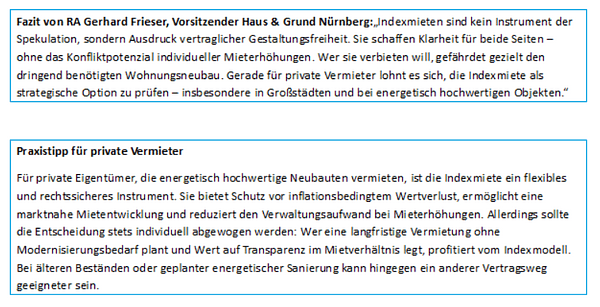 Ein weiterer Vorteil: Bei Indexmieten ist eine Überschreitung der ortsüblichen Vergleichsmiete im Laufe des Mietverhältnisses zulässig. Hier ist allein die Entwicklung des Verbraucherpreisindex maßgeblich – unabhängig von der ortsüblichen Vergleichsmiete. Das verschafft Vermietern insbesondere in angespannten Wohnungsmärkten zusätzliche Planungssicherheit.