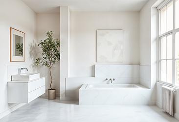 - Bereits bei der Planung empfiehlt sich ein durchgängiges Oberflächenkonzept für Wände und Böden, um Fugen zu minimieren und die Raumwirkung zu stärken.